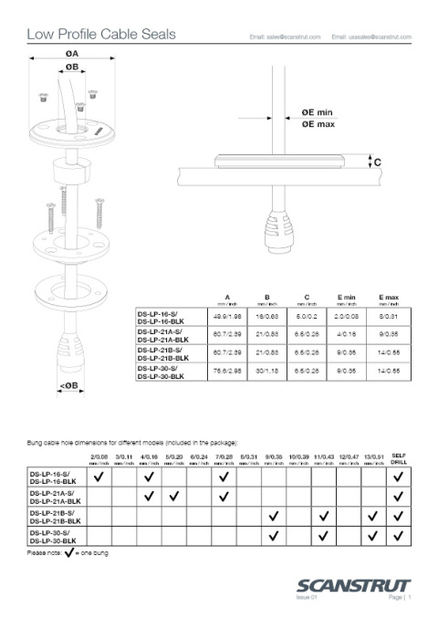 Precyzyjnie wykonana innowacyjna konstrukcja firmy Scanstrut pozwala na zastosowanie kabli o średnicy od 9 do 14 mm (0,35–0,55 cala), zapewniając kompaktowe, niskoprofilowe rozwiązanie, które nie tylko poprawia estetykę, ale także gwarantuje 100% wodoszczelną instalację.