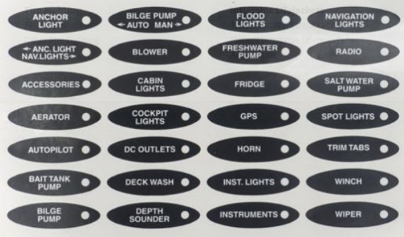 Anc. Light, Nav. Lights, Accessories, Aerator, Anchor Light, Autopilot, Bait Tank Pump, Bilge Pump, Bilge Pump Auto Man, Blower, Cabin Lights, Cockpit Lights, DC Outlets, Deck Wash, Depth Sounder, Flood Lights, Freshwater Pump, Fridge, GPS, Horn, Inst. Lights, Instruments, Navigation Lights, Radio, Saltwater Pump, Spot Lights, Trim Tabs, Winch, Wipe
