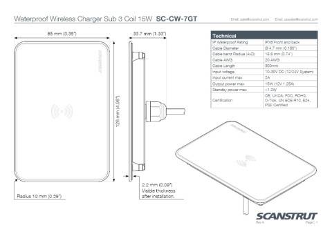 SC-CW-7GT Wodoodporna ładowarka bezprzewodowa Sub, 3 cewki, 15W, 12/24V